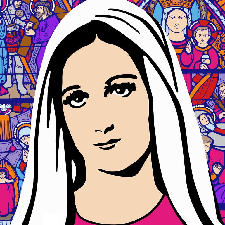 A painted portrait of Maria on a printed background of church windows depicting Mary's life story. Made on canvas in size 100 x 100 x 4 cm. The painting is also available as an ART print in all kinds of different sizes.