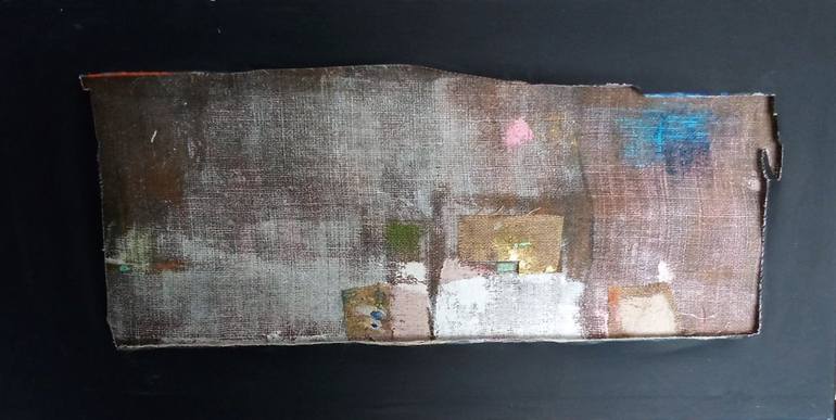 "Mediteran" is a mixed media, abstract and geometric painting. It's texture is almost 3D, since the soft and colorful yarn is hidden or cut off behind black cardboard, giving the impression like it's emerging from the darkness.
