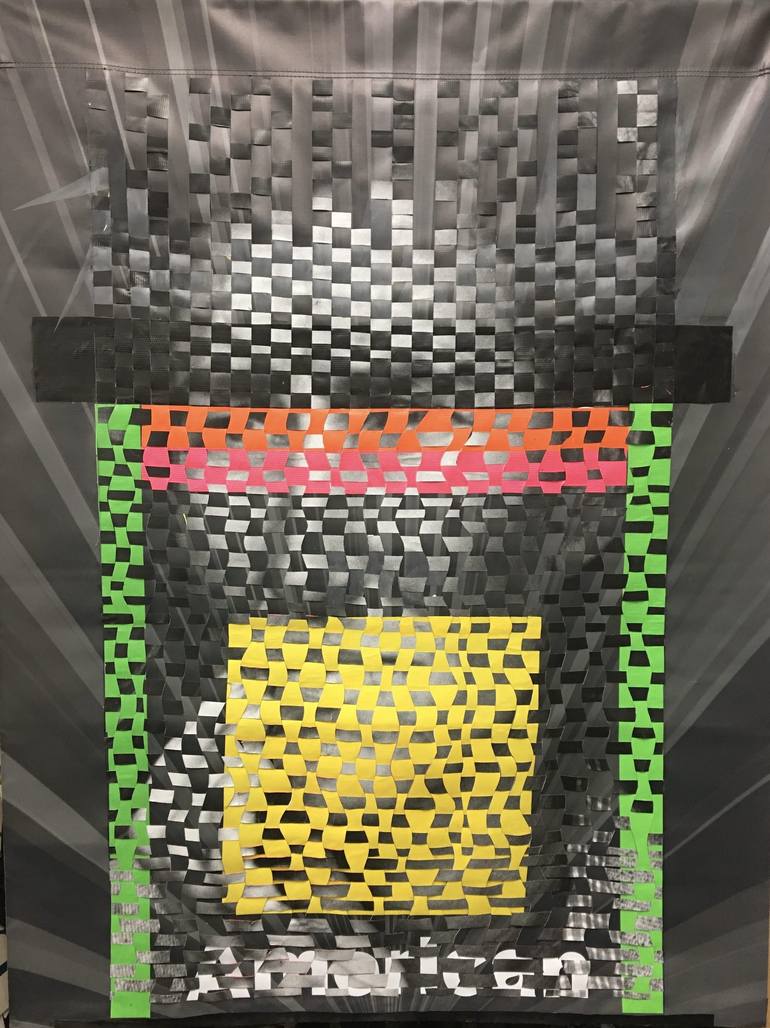 My work centers around repurposing vinyl street banners. This piece had the image of the woman from the dust bowl, the photograph from Dorothea Lange. The image is woven with a geometric shape. The back of the piece has the Red Cross symbol. The piece can be viewed from two sides.