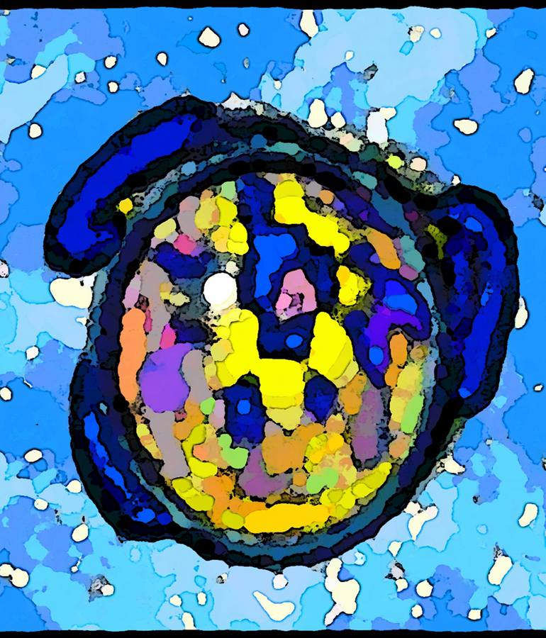 Originaly created on 2003, this piece of art is a microscopic landscape painted with a computer program. It has been used as the cover of a book published later. It represents the eternal life's molecule.