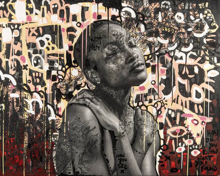 From the tender age of eight, John-Herbert Wright gravitated to painting as an escape, expressing a rich inner world. His work heavily relies upon dark figurations amongst an urban landscape, leaving the viewer space to navigate the world he creates. An analogy of the human condition; centering the female nude/mother and child as the protagonist, he tells the story of the broken seeking respite, the downcast, the Other. Wright seeks to illuminate the universe of darkness within all of us, within himself, and that darkness contrasted with fragility has always been at the epicenter of his work. Wright has managed to create a niche for himself as a painter and street-wear designer, contributing to the role the graphic t-shirt has played in disseminating New York street culture across the globe. Transferring the techniques of garment making onto his canvases, Wright’s paintings feature backdrops of multiple layers of silk-screened images, drawings and text. Although his success has been celebrated, in many ways Wright has also kept his own story on fade. ‘Til now!