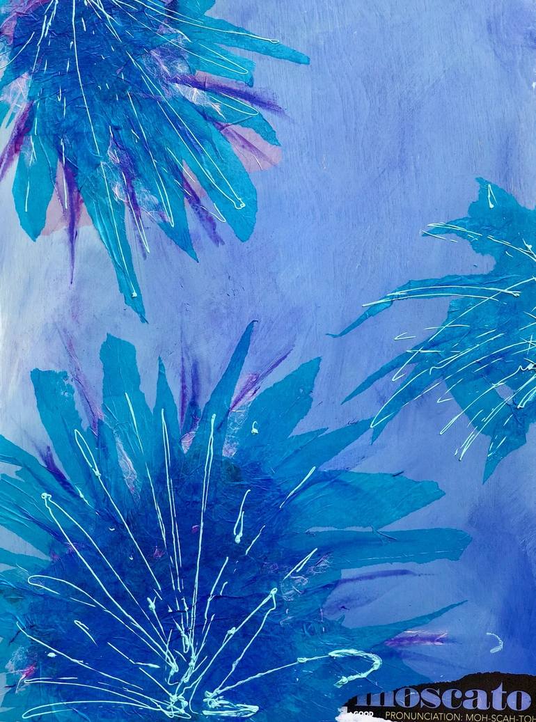 Moscato Palms (2021) Mixed Media on birch wood panel 18 x 24 x 1.5 inches Exhibits: Van Der Plas Gallery New York City (2021) Moscato Palms was inspired by the palms and blue sky in San Diego, California. I originally took a photograph of the sky and palms directly above me. While experimenti...