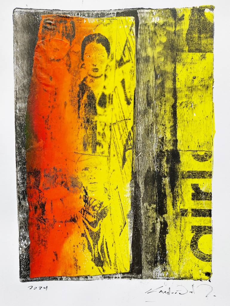 Gel Printing monotype technique on fine art satin paper 200gr. using mixed techniques of coloring with acrylics, china ink, graphite and collage. Comes in a black 18x24 cm MDF frame with a lightweight plastic front.