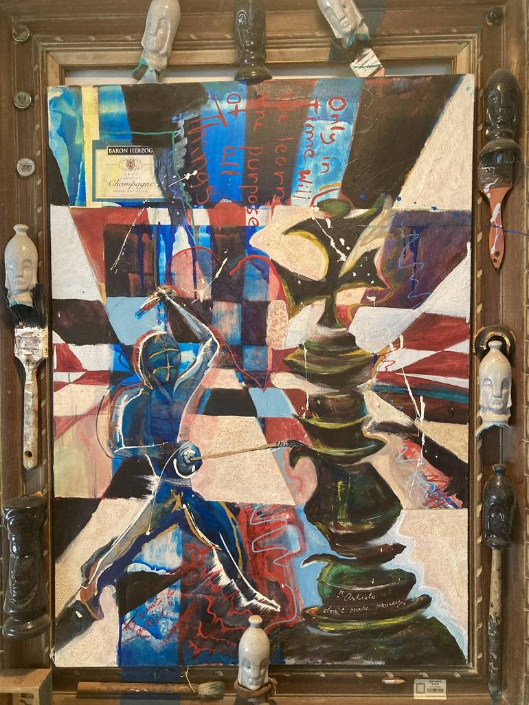 This work was started at UMASS in 1984 and finished in 2016 after viewing Robert Rauschenberg Opening at LACMA. My Dad Mel Schwartz grew up in very humbly New England. He didn't want me to be an artist. In his time most creative people were poor and struggling. This painting symbolizes the struggle...