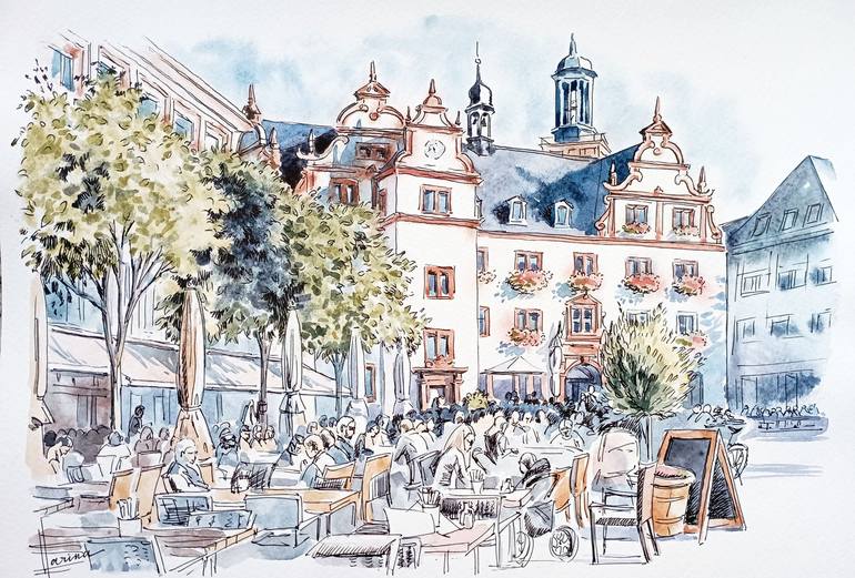Germany street sketch. Old architecture of town. Europe cityscape. Original watercolor painting. An exclusive unique gift for any special occasion and holiday. Interior decoration. Memory to your relatives, family and friends. Original present. Interesting architecture of the old European city....