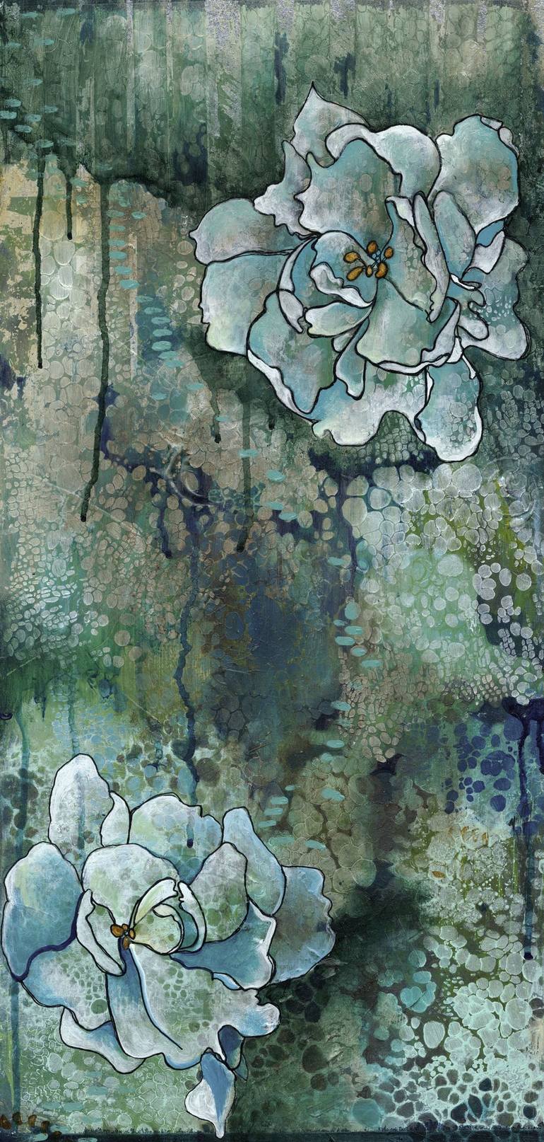 This painting captures two peonies, stationed on opposite ends. Each bloom, bursting with detail and life, anchors an expansive backdrop of multifaceted blues. From cerulean to deep navy and teal, the blue hues interplay with cascading drips, revealing layers upon layers of color, evoking depth and ...