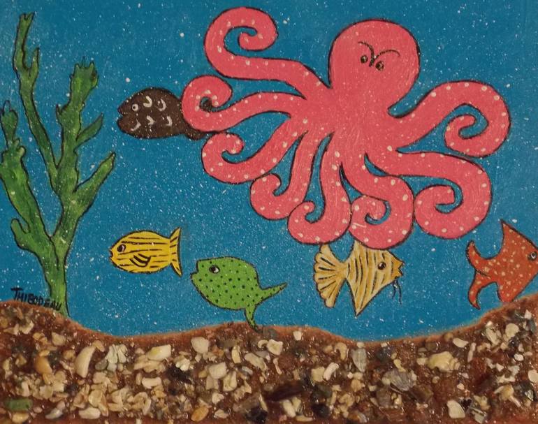 A playful, magical mixed media, abstract, gesso, acrylic painting with white sides on wood cradle panel is Pink Octopus + Fish A pink octopus in the ocean amongst fish and reed with an ocean bottom of found objects washed, dried; shells, crushed shells, beach glass, sand found on the beach of Kits...