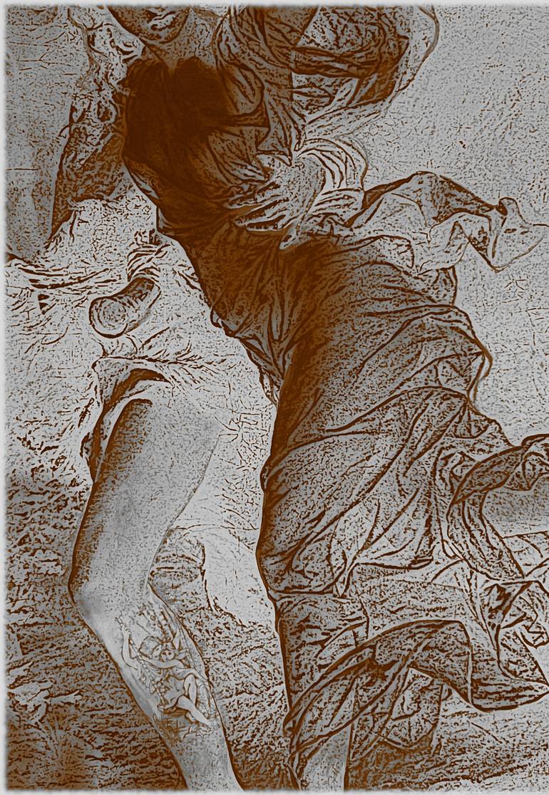 This work is a new contemporary version of a painting called The Storm from French painter Pierre Auguste Cot (Met Museum in New York). It's now "faceless", more universal, always sensual, a little bit erotic, lightly and hopeful. A tattoo on the leg of the boy makes a wink, refer to David Beckham w...