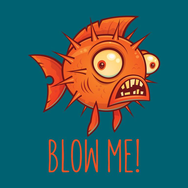 Vector cartoon illustration of a wacky porcupine blowfish or pufferfish with Blow Me text. Keywords: pufferfish, puffer fish, fish, puffer, sea, ocean, marine life, sea life, ocean life, porcupine, spine, spiny, spike, sharp, pointy, blow, blowfish, animal