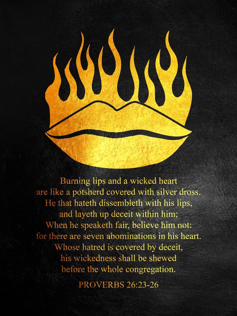 Burning lips and a wicked heart are like a potsherd covered with silver dross. He that hateth dissembleth with his lips, and layeth up deceit within him; When he speaketh fair, believe him not: for there are seven abominations in his heart. Whose hatred is covered by deceit, his wickedness shall be ...