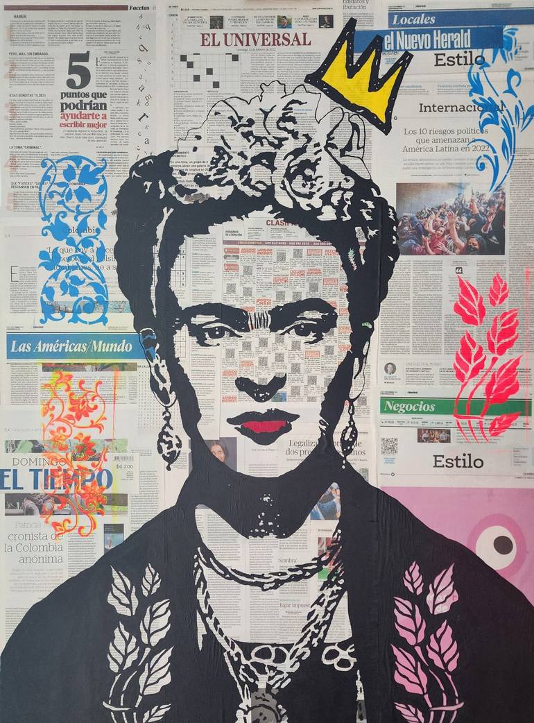 A collage created on newspapers sourced from Latin American countries adhered to the canvas featuring art icon Frida Kahlo created using acrylic paint and spray paint.