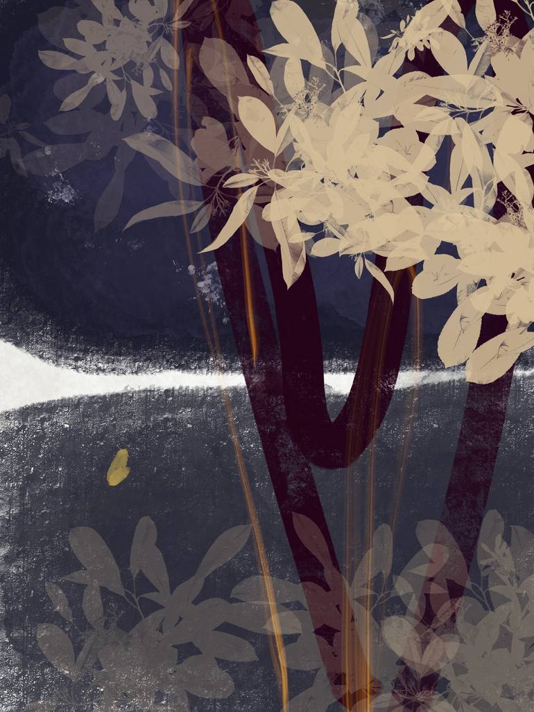 Nature Wall Art - Contemplative Landscape - Night Skyline - Early Morning Sunrise - Foliage - Leaves - Wildflowers - Midnight Indigo Purple - Anthracite Indigo Gray - Dark Purple Plum - Burnt Orange - Cream Pastel Yellow - Honey - Layers of Gradient Texture - Fine Line Drawing - Intricate Details - ...