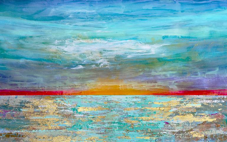 Radiant Dawn 30"x48" on gallery wrapped canvas. Wired for hanging. "Radiant Dawn" is an ethereal portrayal of the ocean at the break of day, where the boundary between sky and sea becomes a realm of infinite possibility. The canvas pulsates with energy as waves dance with unrestrained fervor, their...