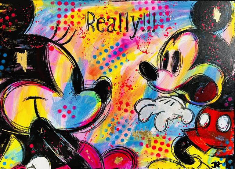 Mickey sorprendido viendo a Minnie La obra presenta muchos colores, haciendo un espectáculo para la vista.