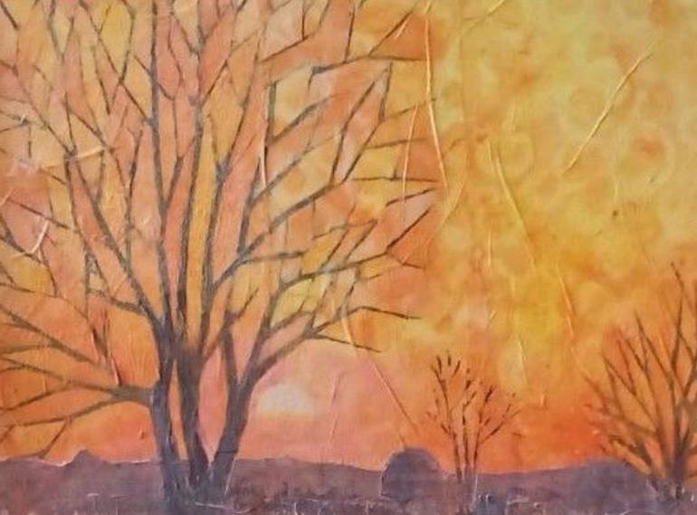 This abstract collage and acrylic painting on card depicts a bare tree silhouetted against a golden winter sunset. The warm, glowing tones of the sunset contrast with the starkness of the tree, creating a striking, tranquil scene that evokes the quiet beauty and solitude of winter evenings. The 'cel...