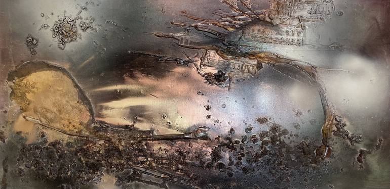 “Rift Valley, Sonde III” is a richly textured mixed-media composition that captures the interplay between natural and abstract forms, evoking the raw beauty of nature. The piece employs neutral earth tones, including bronze, ochre, forest and sea greens, and mauve-wine burgundy, seamlessly blending ...