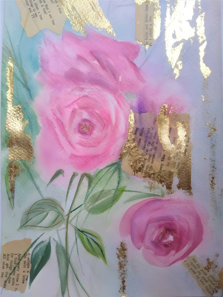 This watercolor painting of pink flowers is done in delicate pastel colors. The rose petals flow smoothly into each other, creating an airy effect. Leaves and stems are painted with thin, light strokes of green color. The painting is decorated with gold inlays and fragments of old pages from a book,...