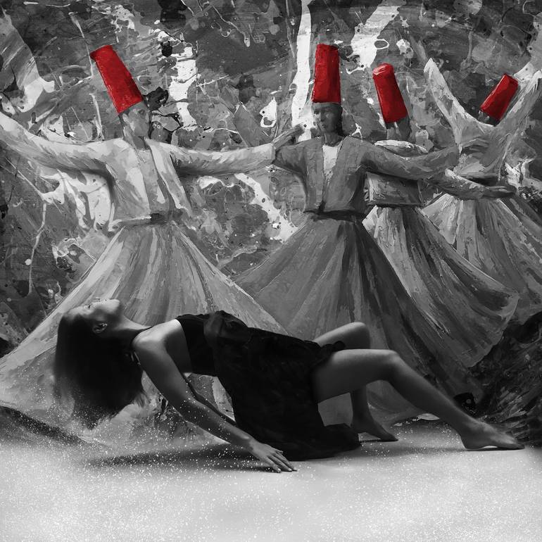Combination of two words: sama dance and drugs. This striking depiction of the Sama dance captures the intensity and euphoria experienced by the dancers, as if they have been transported to another world through the use of a potent drug. The vibrant colors and swirling movements in the artwork con...