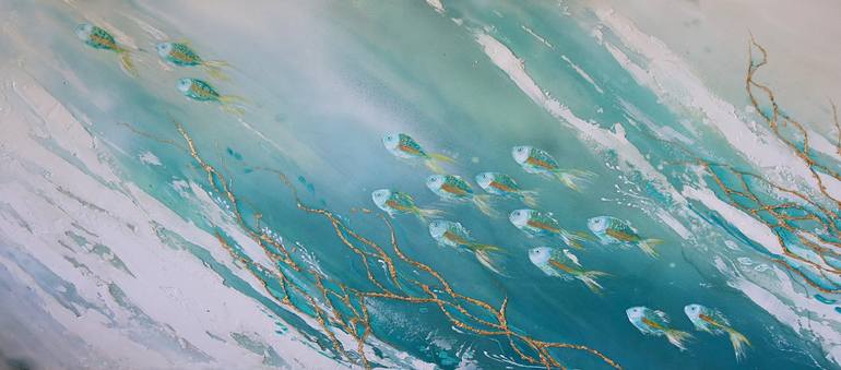 A modern, textured artwork of vibrant school of fish, accented with shimmering gold leaf. Featuring coastal blues and white tones, it embodies a sleek, beach-inspired contemporary style.
