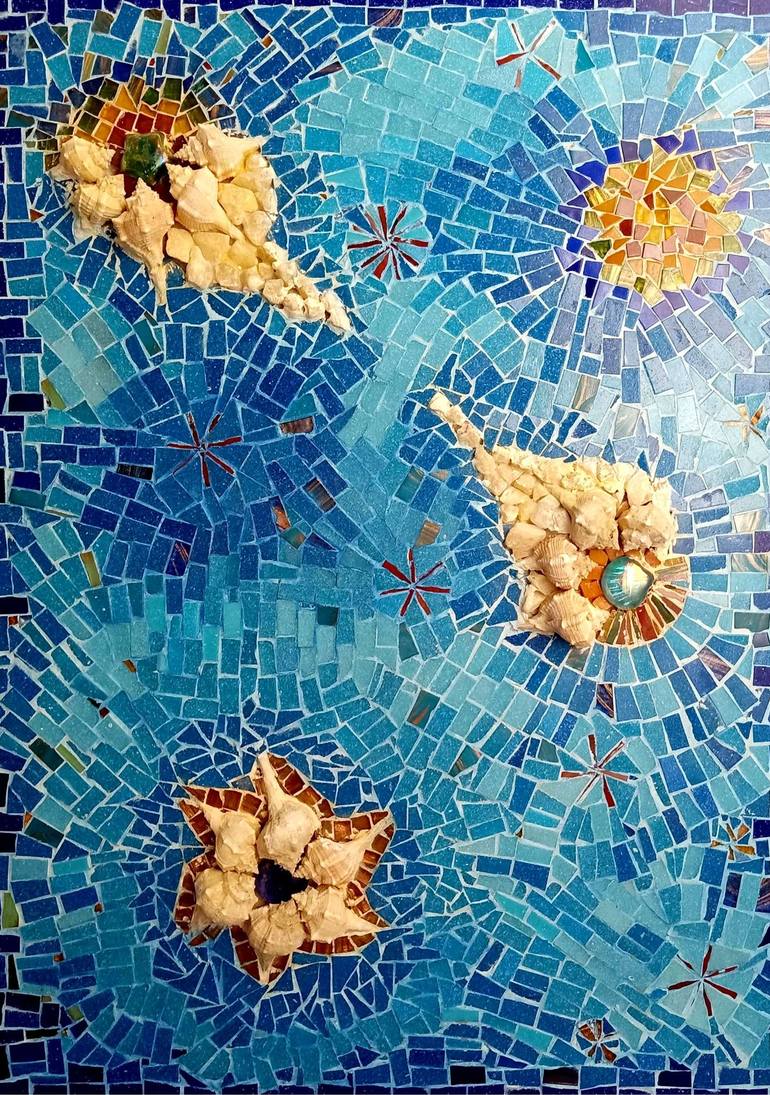 - My inspiration comes from the depths of the sea, as it contains shells, shells, and creatures of various shapes, textures, and sizes. - I hope that the recipient feels the beauty of all the contrasts together in texture, color, and description. - I used the mosaic technique with various material...