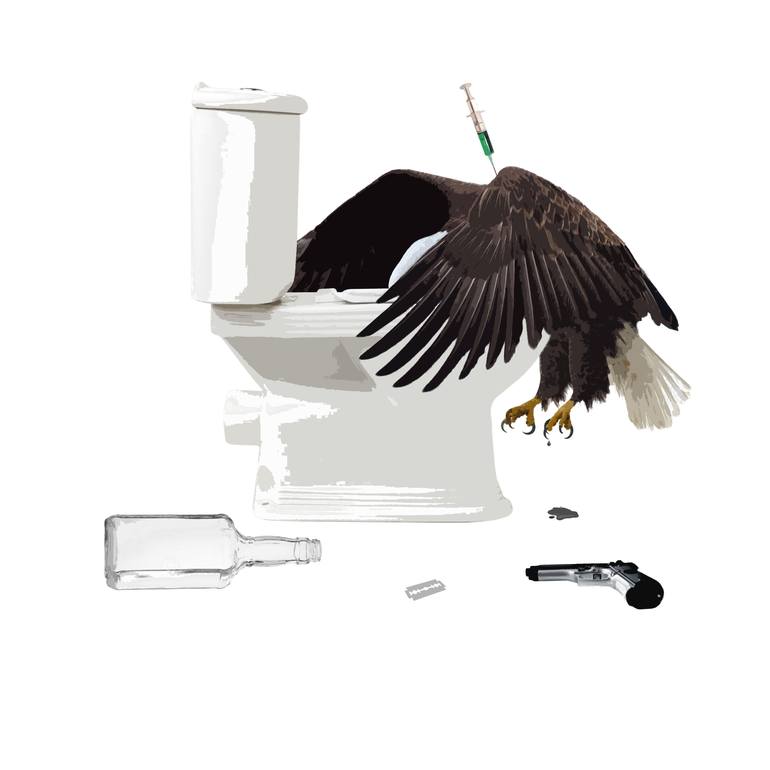 Self-destructive eagle on WC with needle, bottle, razor and gun.
