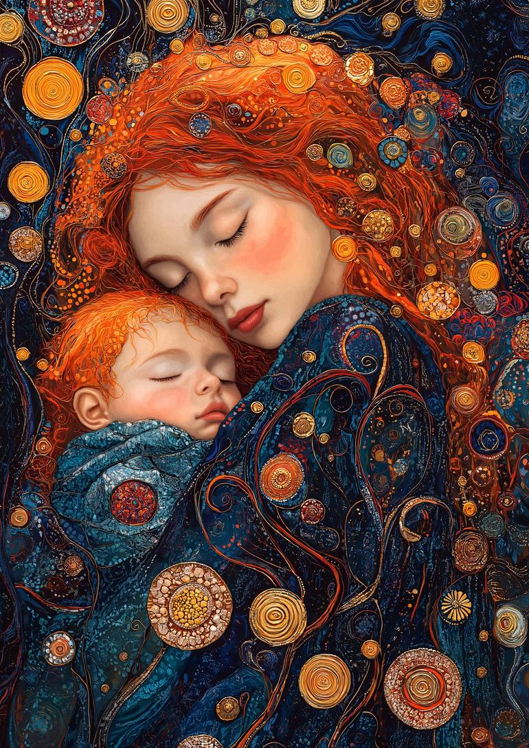 A tender moment between a mother and child is captured with the child in a peaceful slumber in the mother's embrace. The background and their clothing are adorned with vibrant, whimsical circles and patterns that elicit a sense of dreaminess and warmth, while the mother's orange-red hair cascades ar...