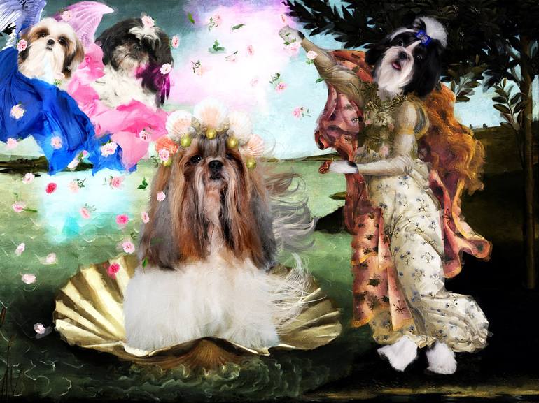 Shih Tzu Dog Artwork inspired by The birth of Venus Sandro Botticelli, famous Italian Renaissance Masterpiece.