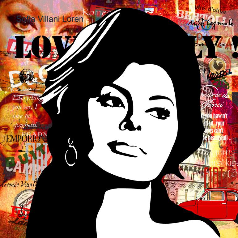 A painted portrait of Sofia Loren on a printed background of typical Italian pictures, drawings and texts, various paintings by Leonardo Da Vinci (Mona Lisa, the last supper and Vitruvian man), a piece of text from Romeo and Juliet, the eyes of Sofia Loren, signatures of Verdi, Colombus, Felini, Pav...