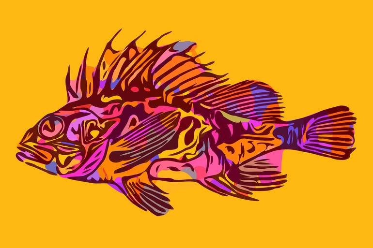 A digital pop art painting loosely based very loosely on a vintage Scientific illustration of the venomous South Australian cobbler fish. I used a vibrant rainbow of yellow, red, orange, pink, blue, purple and brown for my whimsical aquatic wildlife portrait.