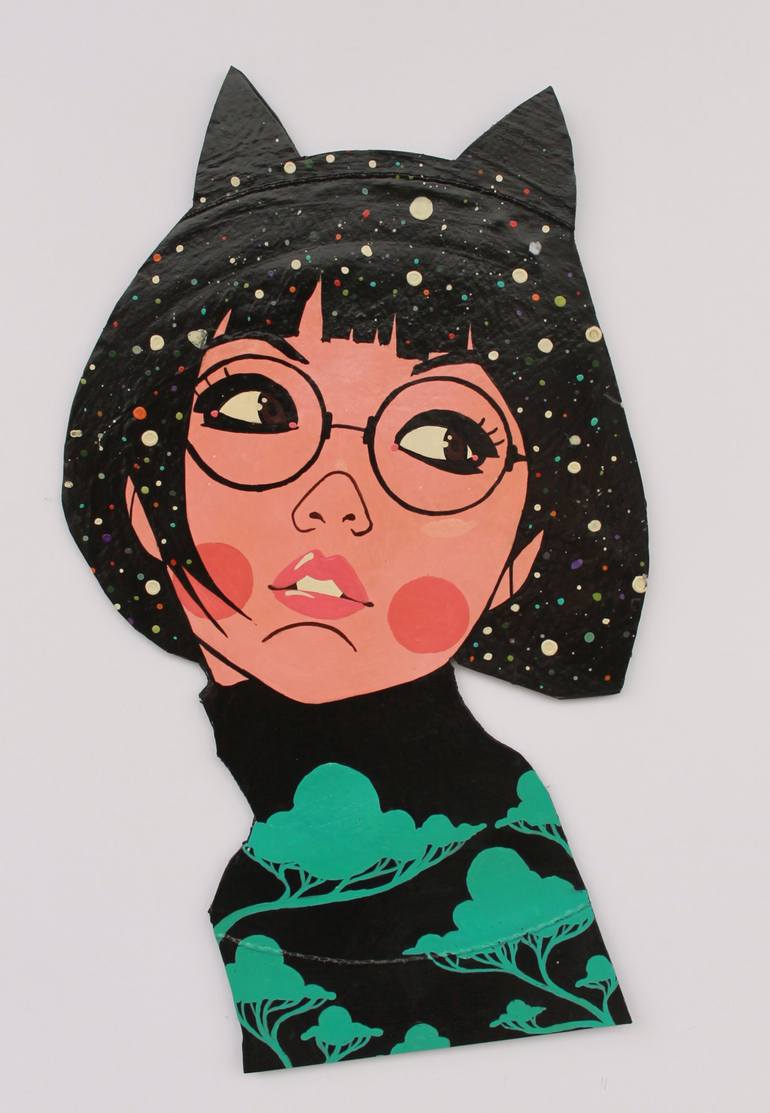 I drew a girl in a black sweater with patterns of natural motifs with stars in her hair and cat ears and glasses with a bob haircut that emphasizes her unique and sophisticated style. It is made on leather with acrylic paints and covered with a layer of varnish on top to protect it from damage. Afte...