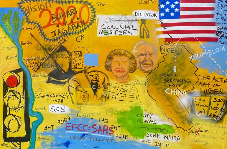 The painting "State of Affairs; Nigeria" depicts Nigeria's current economic challenges. It highlights rampant inflation, which has significantly reduced the purchasing power of Nigerians, leading to soaring costs of basic goods and services. The once-stable currency now symbolizes economic instabili...