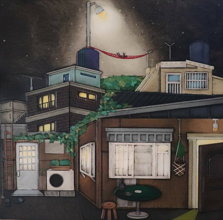 This painting depicts a moment on a sweltering summer night, resting under the starlight after a long day. The material used for this artwork is paper, and its natural color was utilized as it is. After completing the process of cutting and pasting the paper, printmaking ink is applied and then wip...