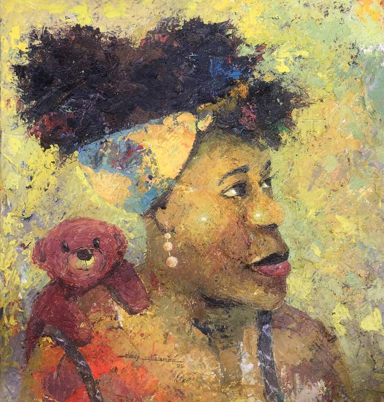 The Gazers is an evocative piece rendered in acrylic and mixed media, portraying a lady with a scarf, gently carrying a teddy bear on her shoulder. The textured strokes and dynamic layering capture a quiet moment of connection and reflection, inviting viewers to contemplate themes of companionship a...