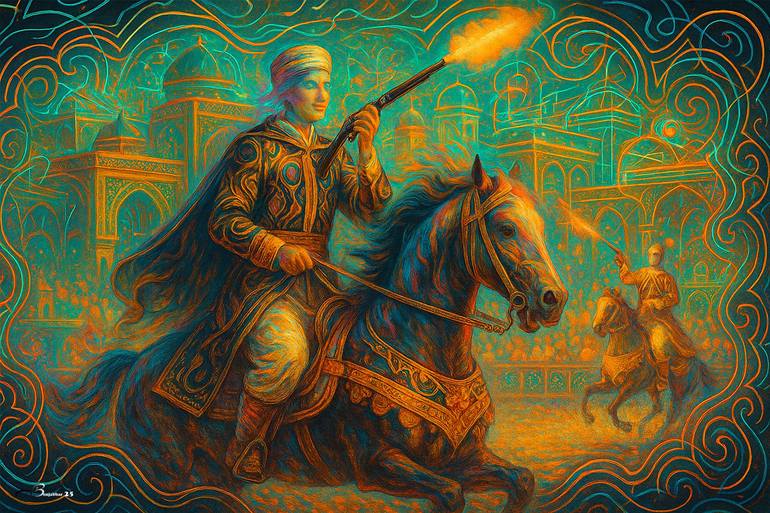 A rider in elaborate clothing wields a torch while mounted on a decorated horse, surrounded by a vibrant, swirling backdrop of intricate architecture. The vivid colors and patterns create a sense of movement and energy throughout the scene.