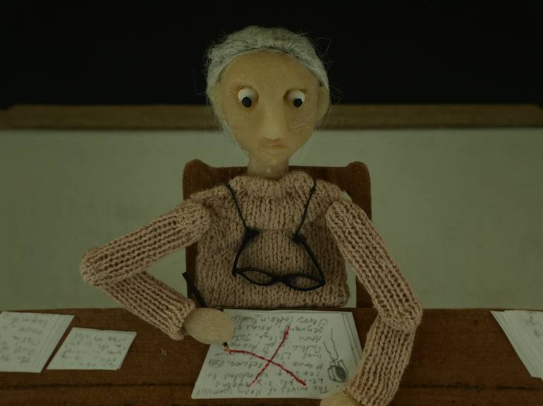 Still from stop motion animation 'Heirlooms'. The school teacher is marking the pupils work.