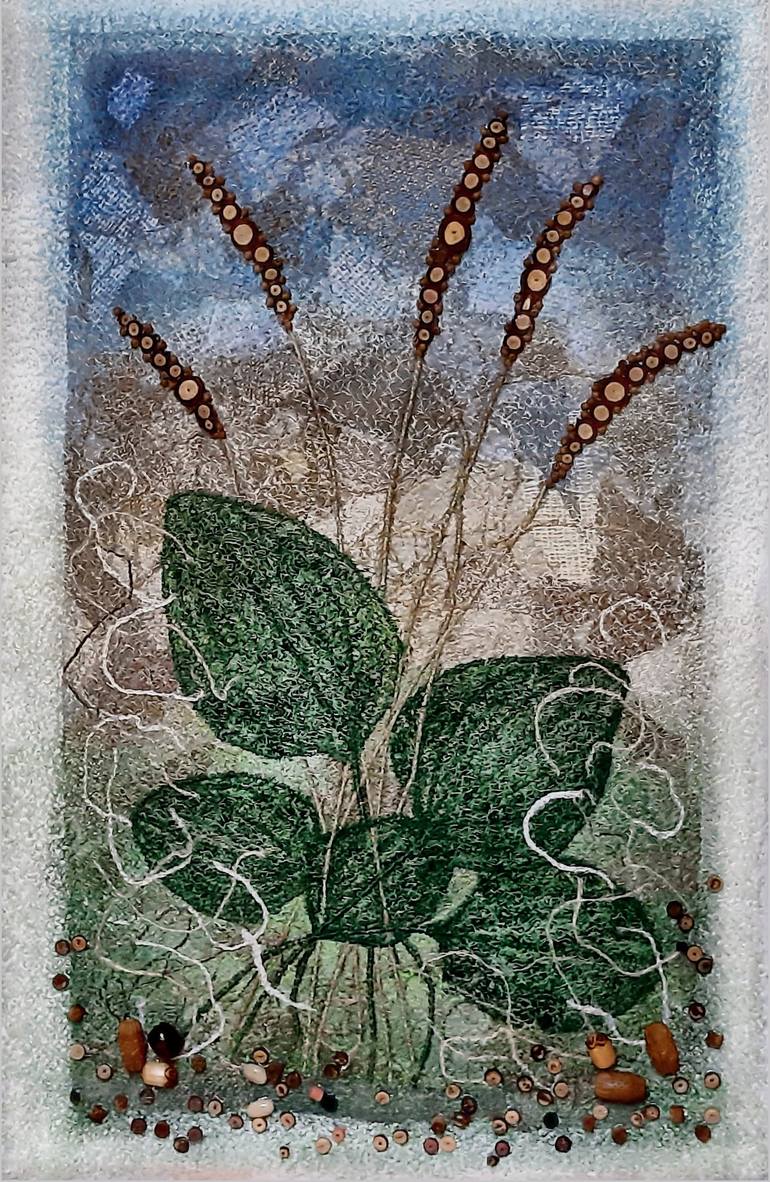 Decorative interior panel in mixed media: applique from pieces of canvas, ropes, twines, painted on top with diluted acrylic paints, prints of plantain leaves, all thickly embroidered on top using free author's machine quilting and embroidery. Finally, I glued on pieces of cut thin pine twigs and wo...