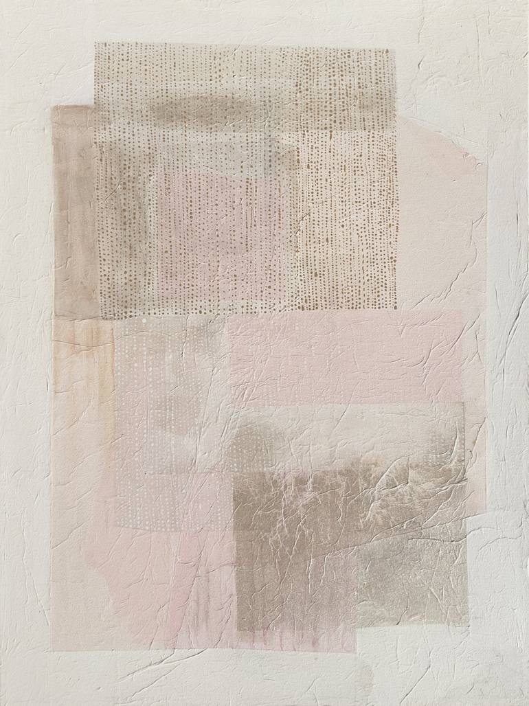 A serene composition inspired by the principles of Japandi and Wabi-Sabi, this textured mixed media artwork blends hand-painted archival paper with soft, neutral tones. Layers of delicate, translucent materials create a sense of depth, imperfection, and organic beauty, evoking themes of impermanence...