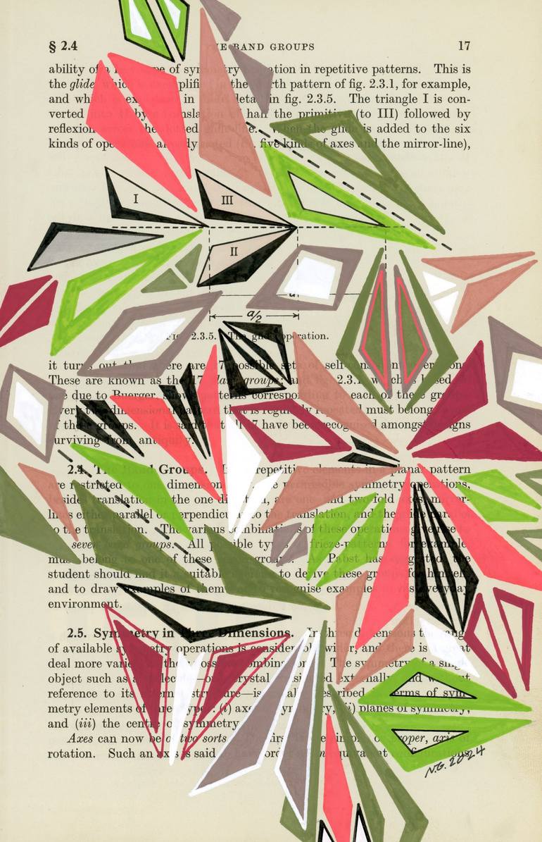 Original mixed media artwork with acrylic paint and India ink on vintage text book page, approx. 5 3/4"x 9".