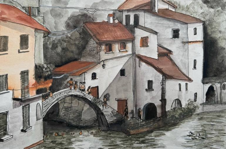 The historical stone bridge over the gorge at Nesso on Lake Como. On such a hot day the lake tempted people to jump off into the cool waters below..