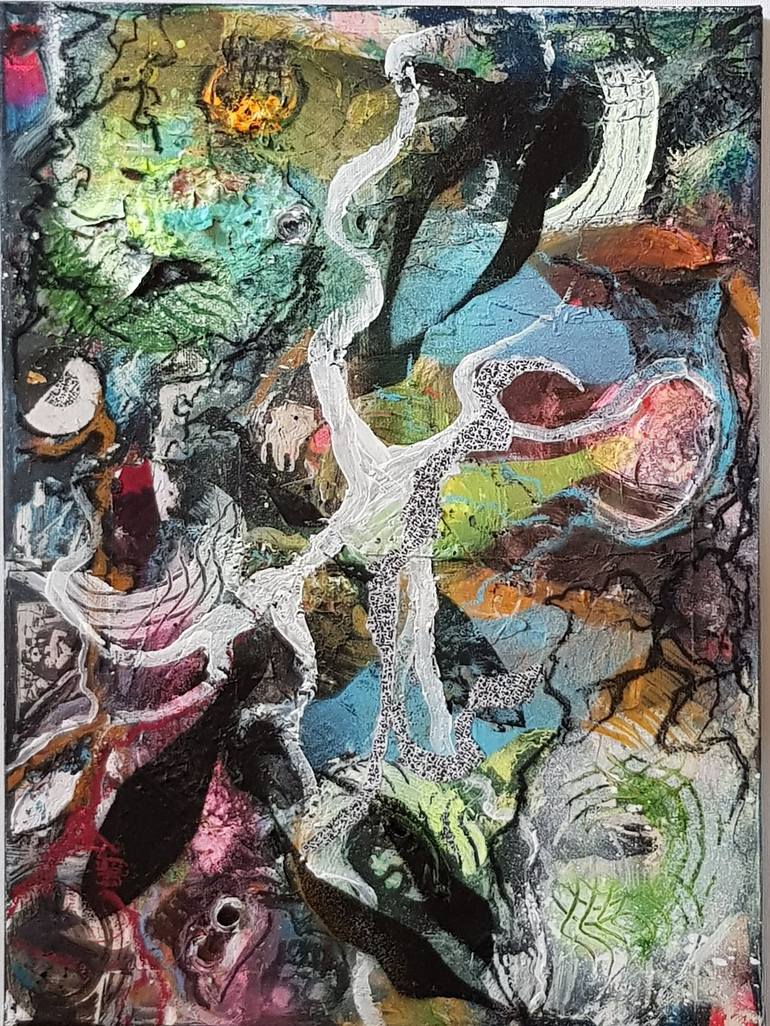 Artist Sarah is a mixed media artist working from her studio in Kent. She makes both large and small scale work experimenting with each material deconstructing and transforming each medium and their rules into one. Sarah uses acrylic and oil paint mediums, found materials, selfmade collage fragments, foil leaf and other mixed media as a means of experimentation, playing with the ideas of space and process typically using portraiture, mythology or land/seascapes as inspiration and a starting point. Sarah does not look for a formula to reproduce but rather she immerses herself in her work with a constant curiosity and a sense of potential discovery.
