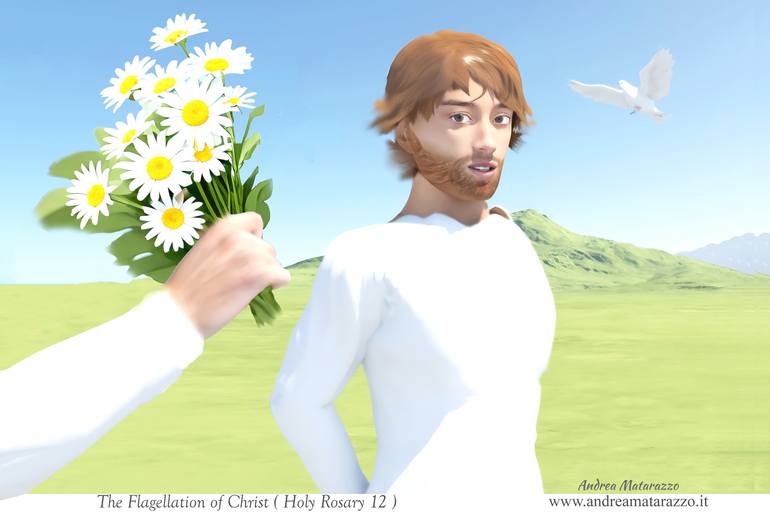 The Flagellation occurs during the process of Jesus ( The scourge is replaced by a bouquet of flowers, symbolizing a peaceful instrument, and stop the violence ). Artwork inspired by famous paintings from the past of Piero della Francesca and others. Religious theme interpreted with the modern Comp...