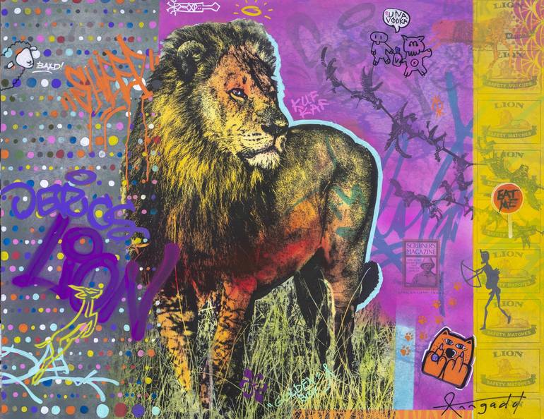 The mighty Golden Boy lives and rules in the Okavango Delta in Southern Africa, where I photographed him. Then, having converted the photo to black and white, I start a series of layers, bringing Bushman (Khoi) rock art and contemporary graffiti to integrate ancient and modern forms of expression. I...