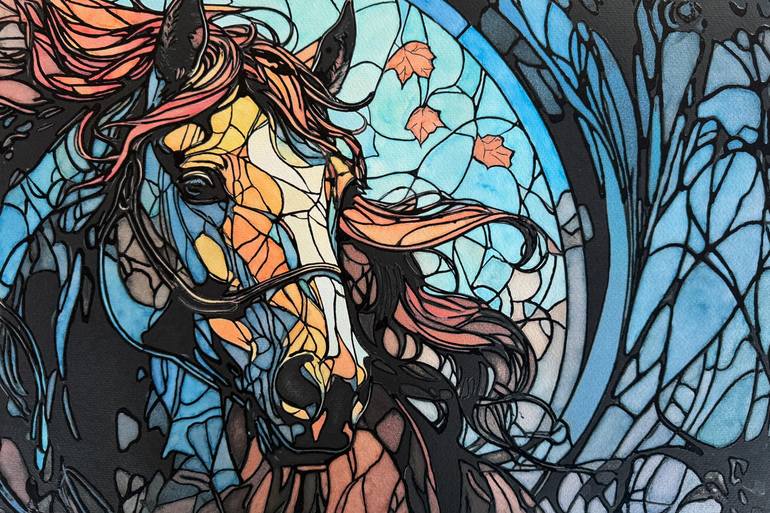 The Last Gallop of Fall Year: 2025 Size: 12" x 18" Media: Alcohol Inks, Pen & Ink Substrate: 140# Coldpress Watercolor Paper A striking portrayal of the powerful energy of autumn, captured through the graceful movement of a horse caught in the wind. Using a blend of alcohol inks and pen & i...