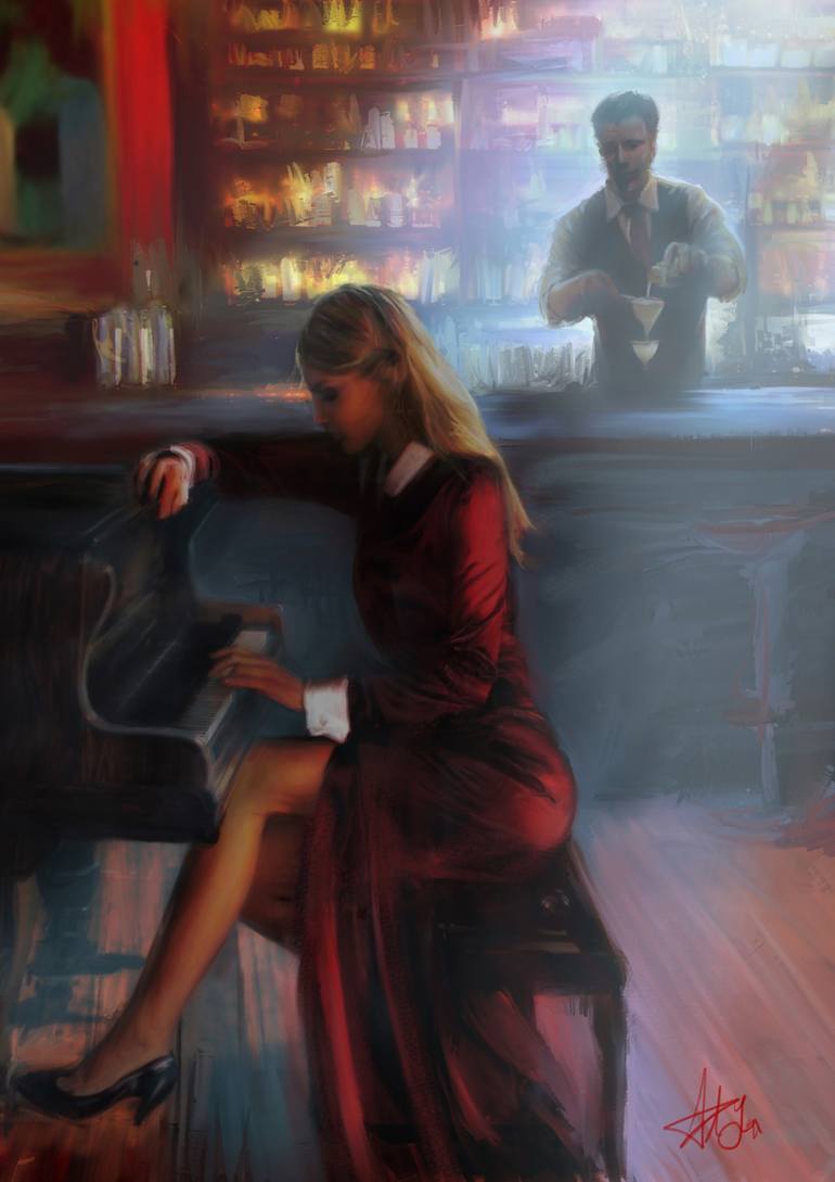 One half of a set depicting women playing the piano. This one the blonde pianist was painted first with the scene shifting around her. The original is finished with an acrylic medium for greater depth in the colours.