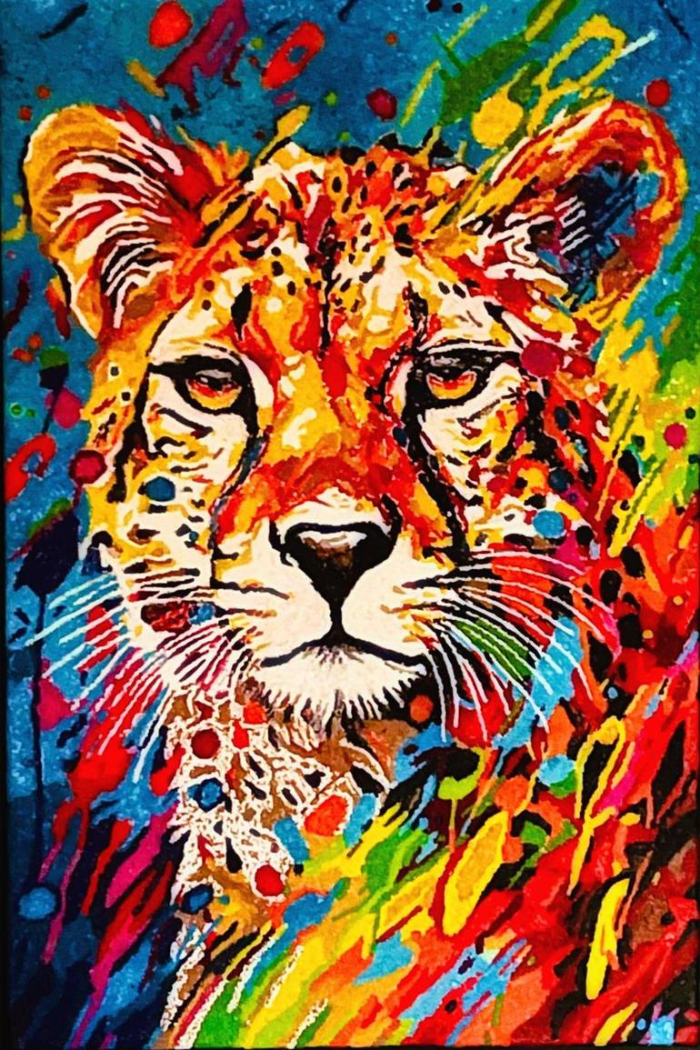 Melted, blended, layered and textured wax crayon on canvas for all your home and office décor. Unique and different. This electrifying painting captures the essence of a cheetah in a blaze of vibrant colour and explosive energy. With piercing eyes and a poised expression, the cheetah radiates pow...