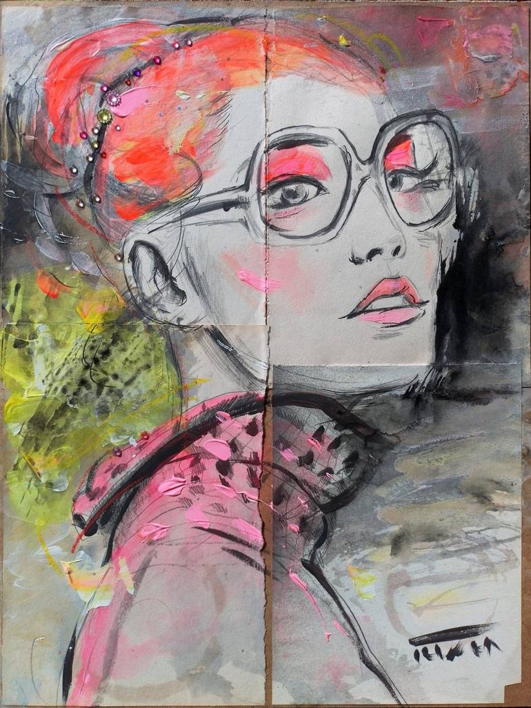 - original drawing on paper collated on board - gouache, pencil, collage (colored glass pebbles, paillettes) on board - the artwork is sprayed with museum quality fixative - COA certificate of authenticity - the colors may look different on other devices/ screens