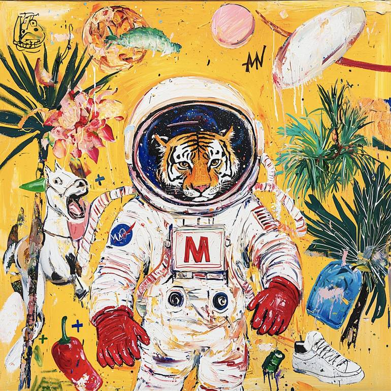 This vibrant and playful piece brings together the worlds of fantasy, fashion, and quiet satire. A tiger, dressed in a vintage-style astronaut suit, stands proudly against a bright yellow backdrop — not in outer space, but in a surreal, tropical dream. Around him, symbols of luxury and pop culture f...
