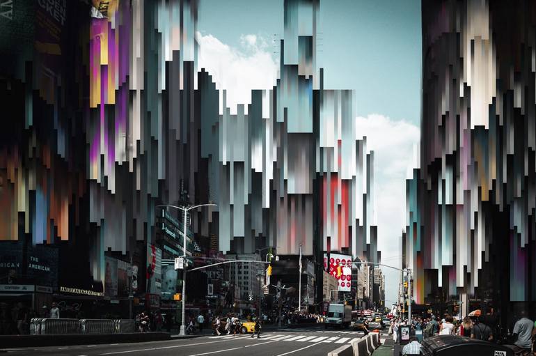 "Times Square – Where Neon Dreams Pixelate into Memory Fragments" In Times Square from Thomas Haensgen's Kinda New York series, the iconic chaos of this famous crossroads undergoes a metamorphosis. Towering billboards and bright lights disassemble into pixelated vertical streaks, as if the city its...