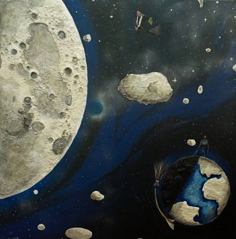 This artwork tells the story of a young boy on a broom, flying toward the moon. It is a metaphor for pursuing education and dreams—reaching for achievements as high as the moon. The broom is not just a mode of flight—it symbolizes my father, a street sweeper, whose humble work helped fund my studie...