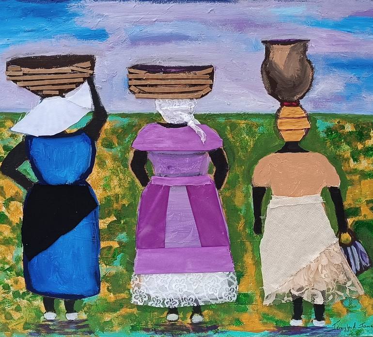 Toute Bagaille, acrylic, fabric and carton, 16"x20" The market ladies, the original entrepreneurs, are on the way to market. With baskets and vessels on their heads, they are off to make money to feed their families.